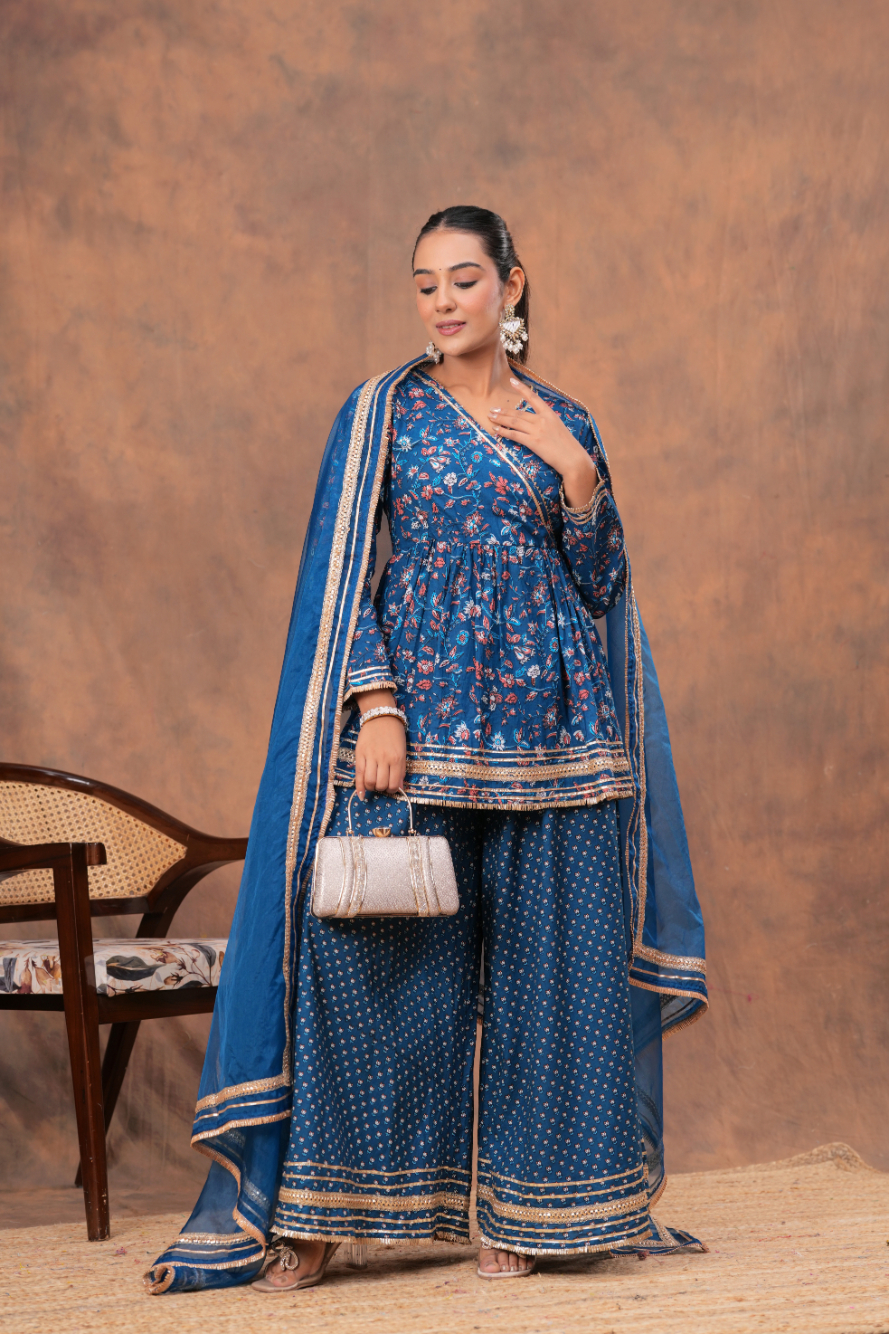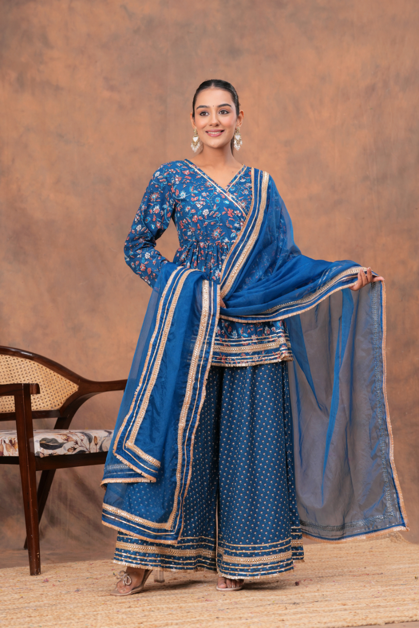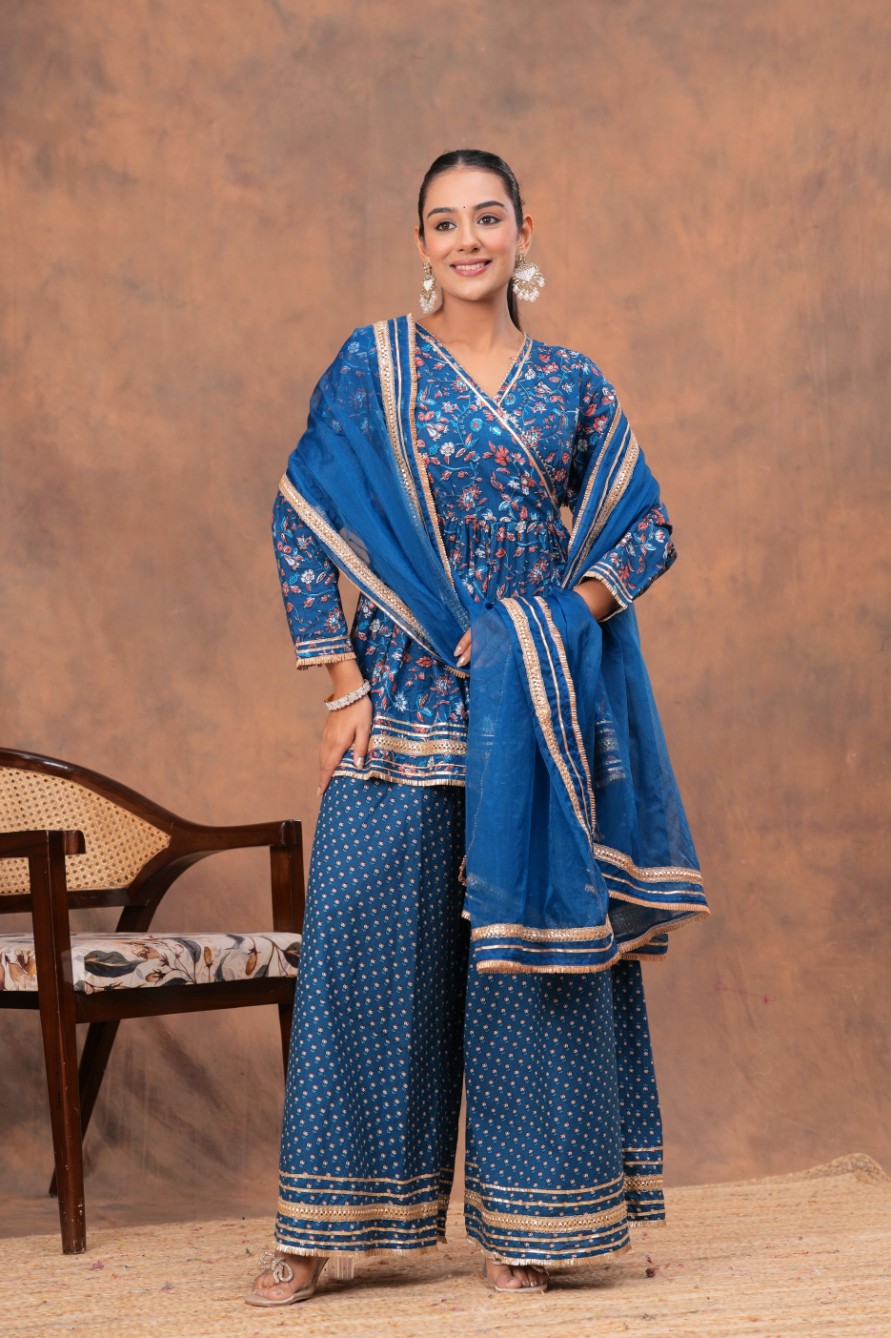 Key Features of Blue V-Neck Kurta Palazzo Set: