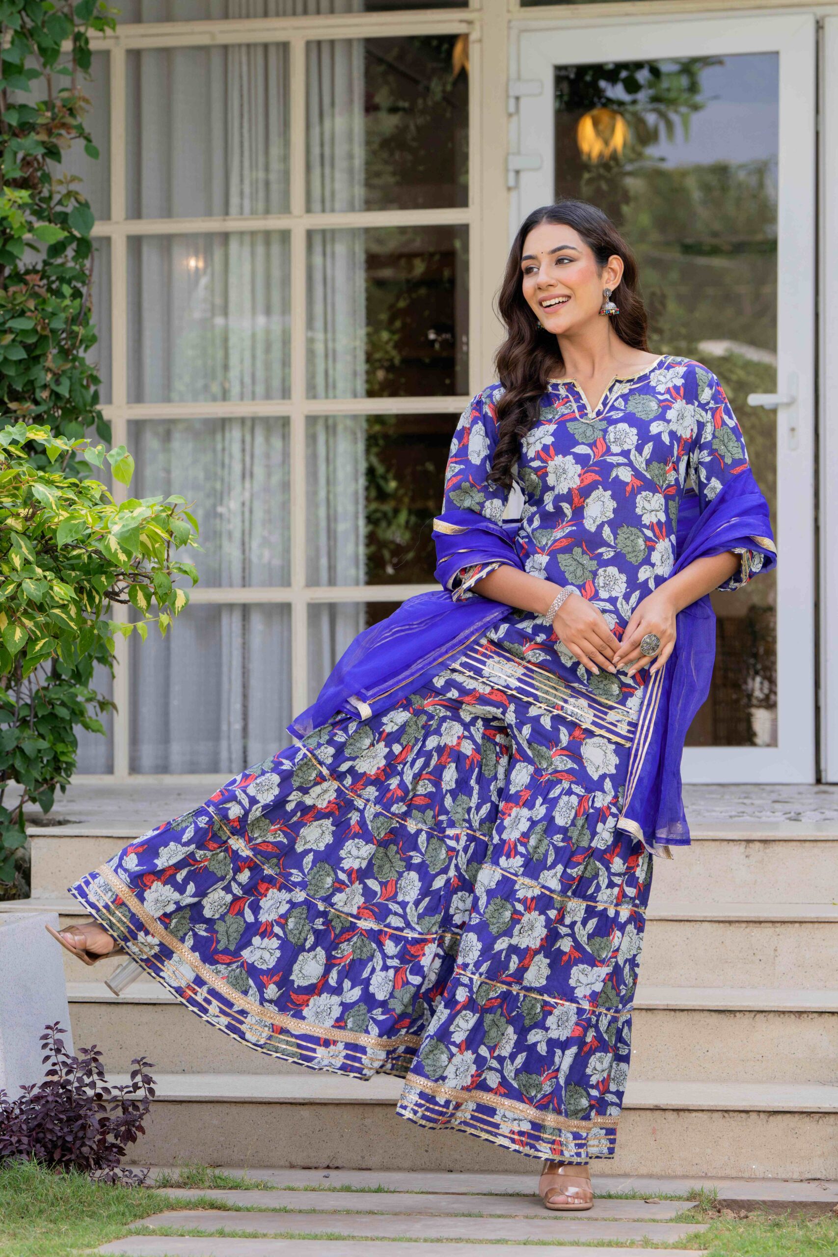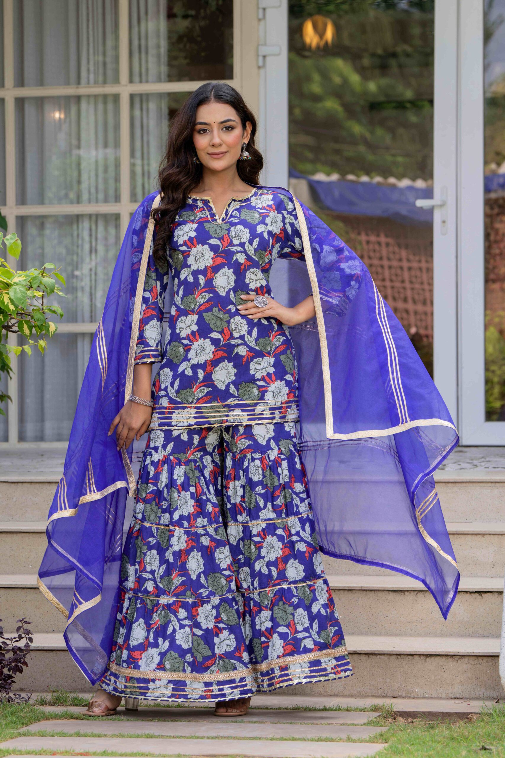 The Blue V-Neck Kurta Palazzo set from Kamee is the perfect blend of comfort and style. Made with pure cotton, this outfit ensures breathability and softness, making it ideal for all-day wear. The V-neck design offers a flattering silhouette, while the intricate prints add a touch of elegance. The rich blue color brings a fresh and vibrant feel, while the matching palazzo pants and dupatta complete the set for a chic and coordinated look.