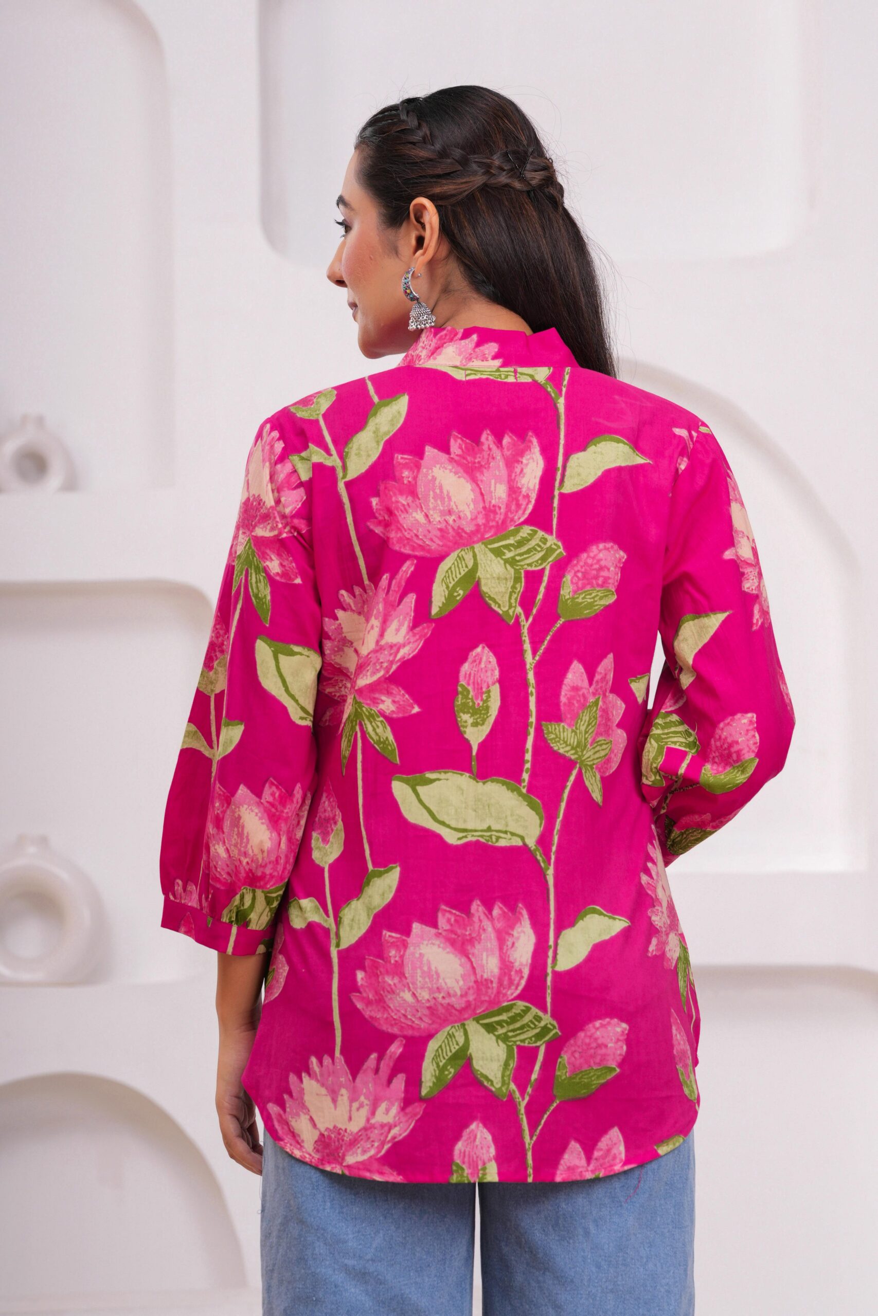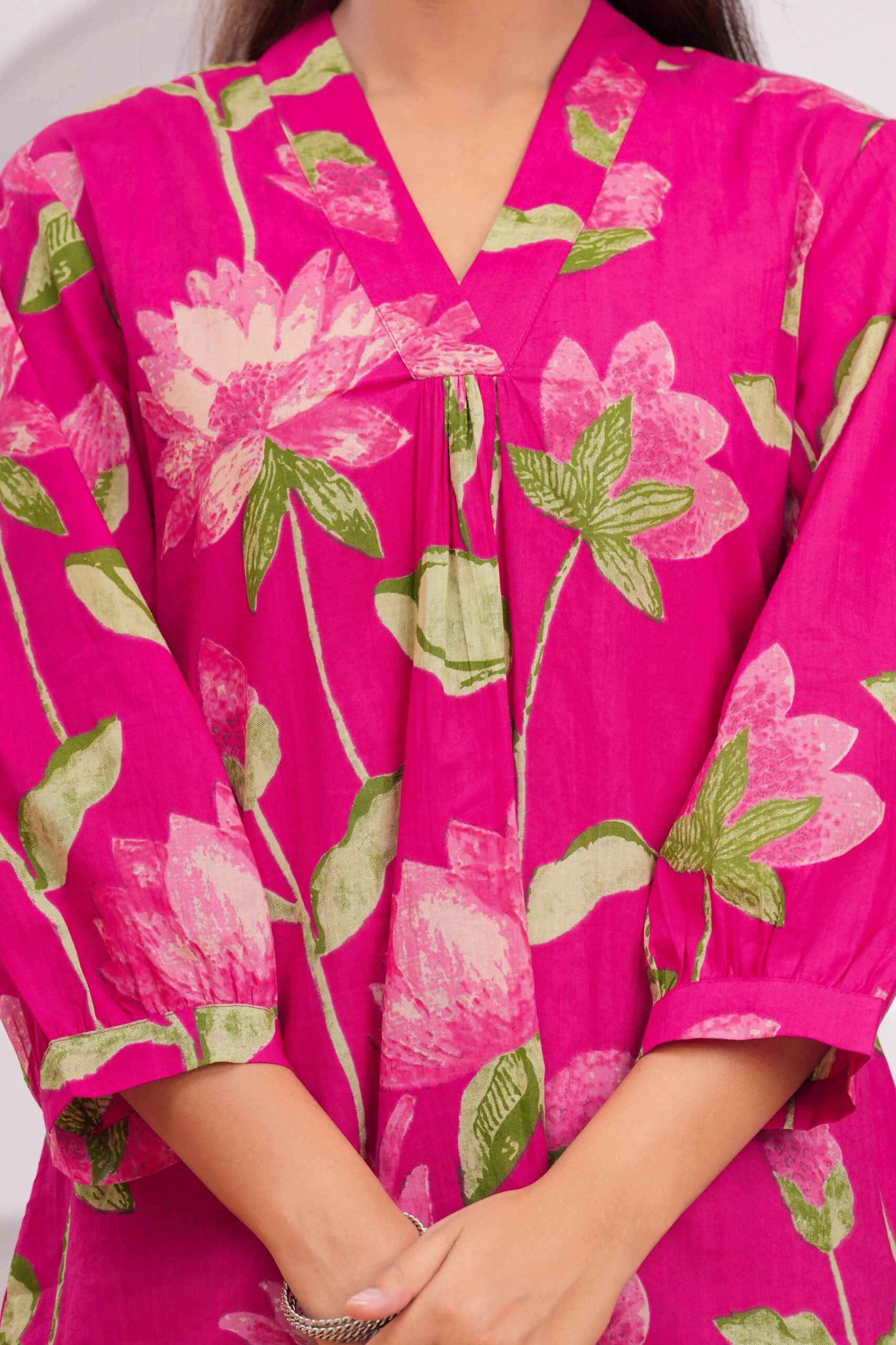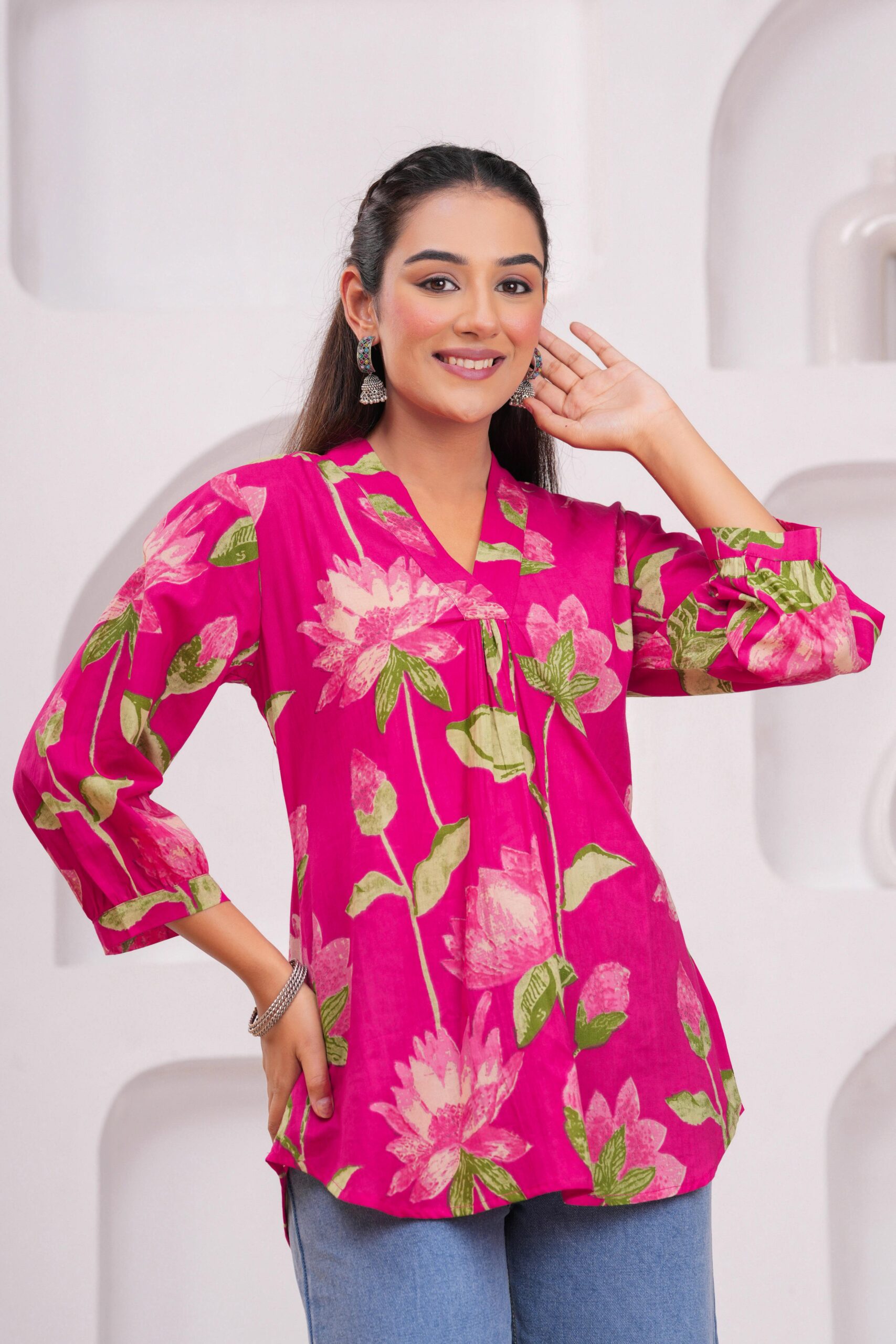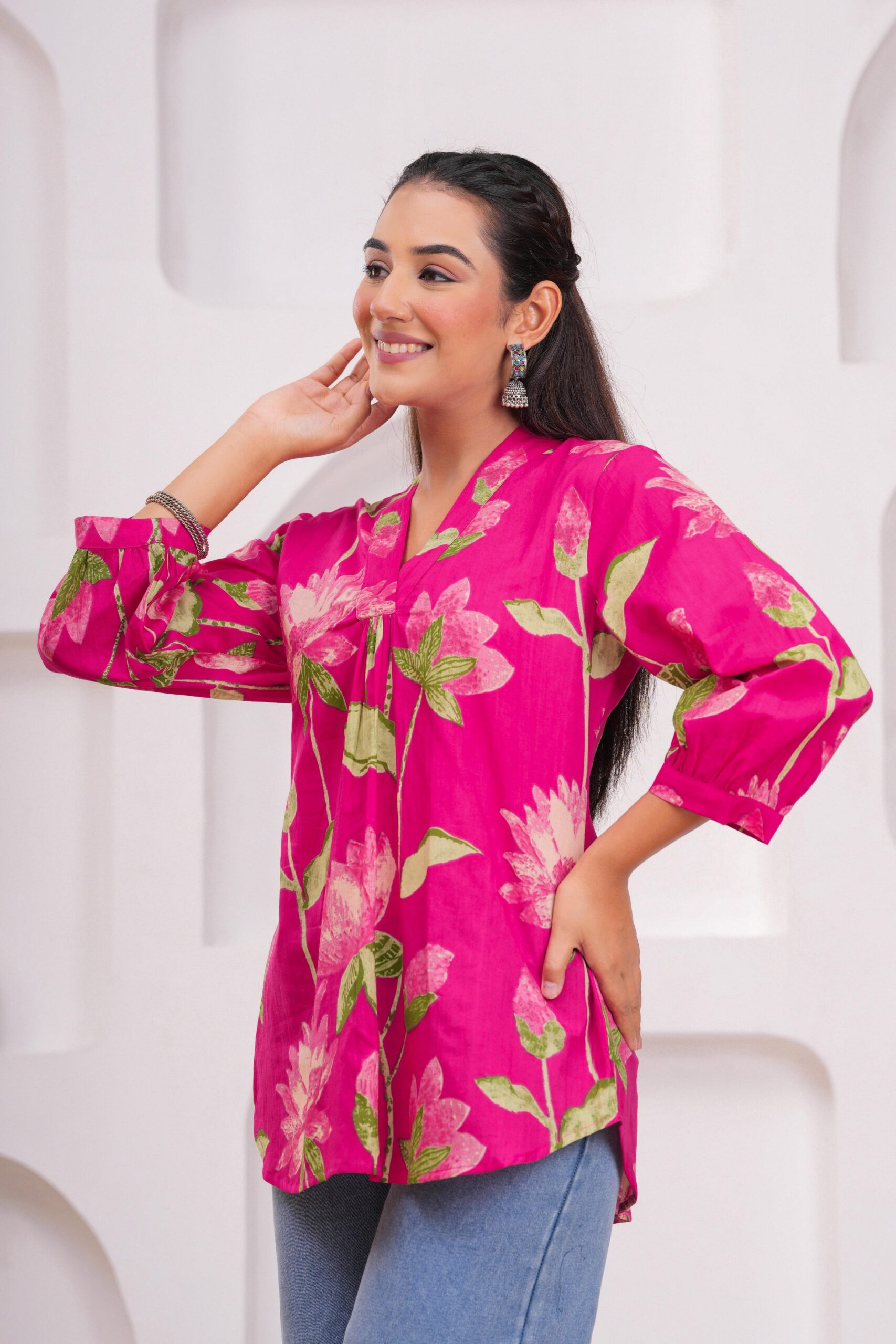 The Kamee Floral V-Neck Kurti in a beautiful pink hue is the perfect combination of comfort, elegance, and style. Crafted from 100% pure cotton, this kurti provides a soft and breathable fit, ensuring you stay comfortable all day long. The delicate floral print adds a touch of femininity, while the flattering V-neckline enhances your natural shape. This kurti is versatile enough for both casual outings and semi-formal events, making it a wardrobe essential.