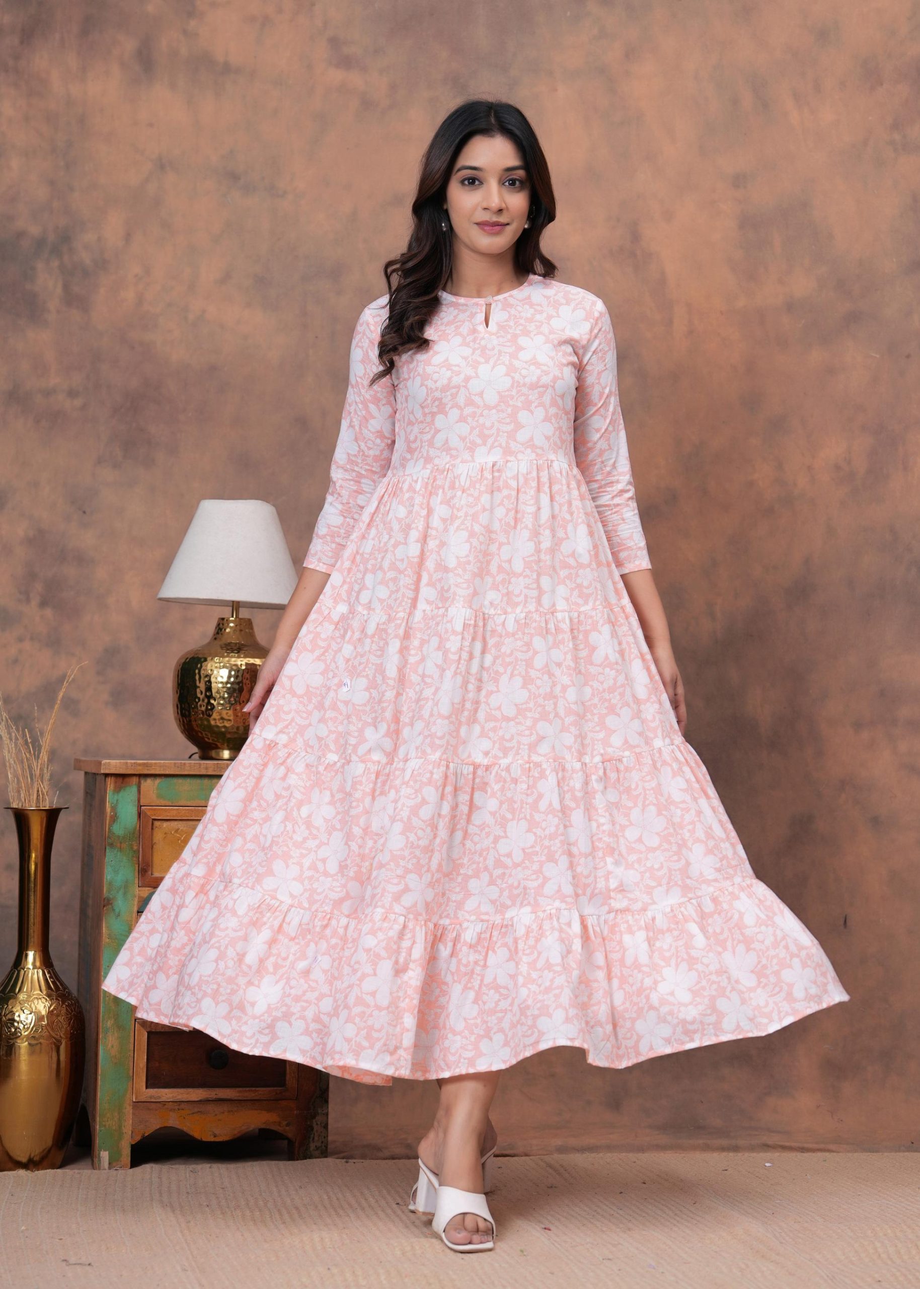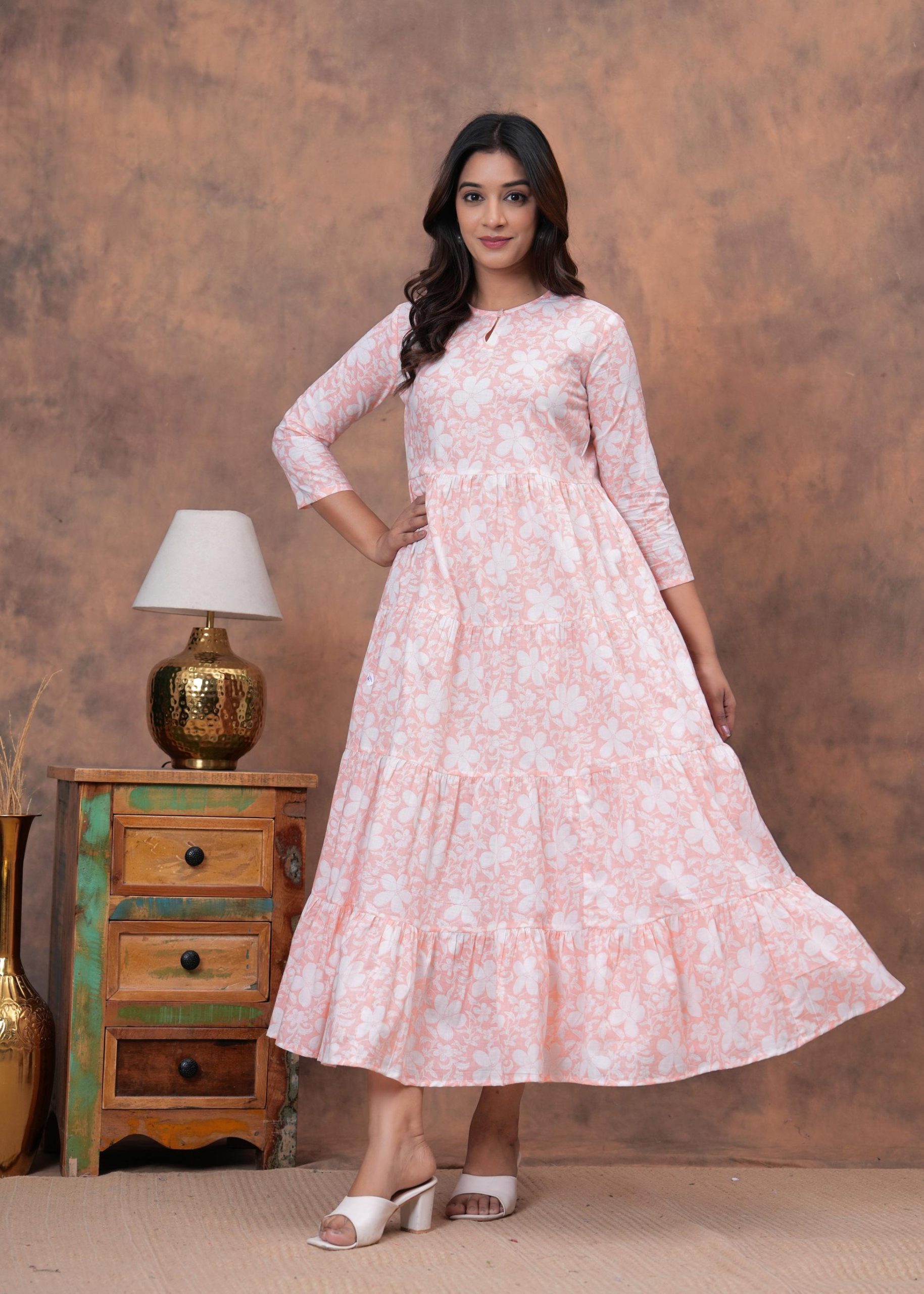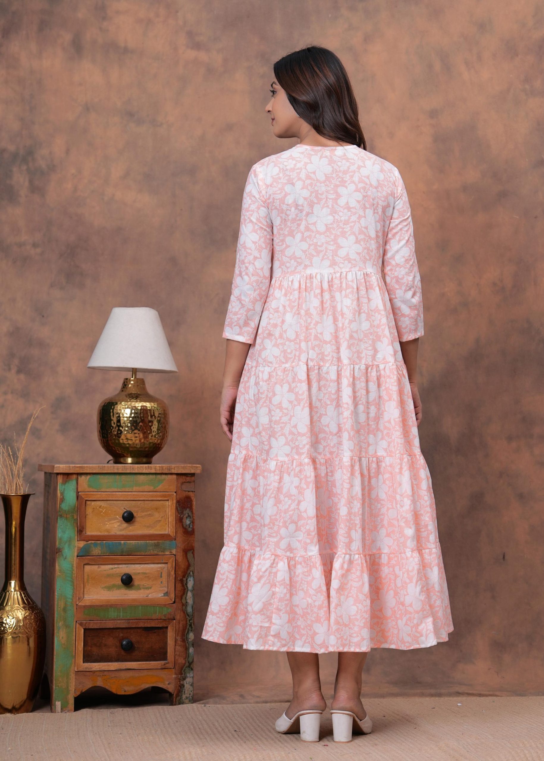Designed with three-fourth sleeves, the Kamee Peach Cotton Floral Dress offers the perfect balance of coverage and breathability, ideal for transitional weather. The A-line silhouette flatters your figure while providing ample freedom of movement, making it suitable for casual outings, brunch with friends, or a relaxed day at the beach. The floral print adds a touch of femininity and sophistication, making it versatile for both day and evening wear.
