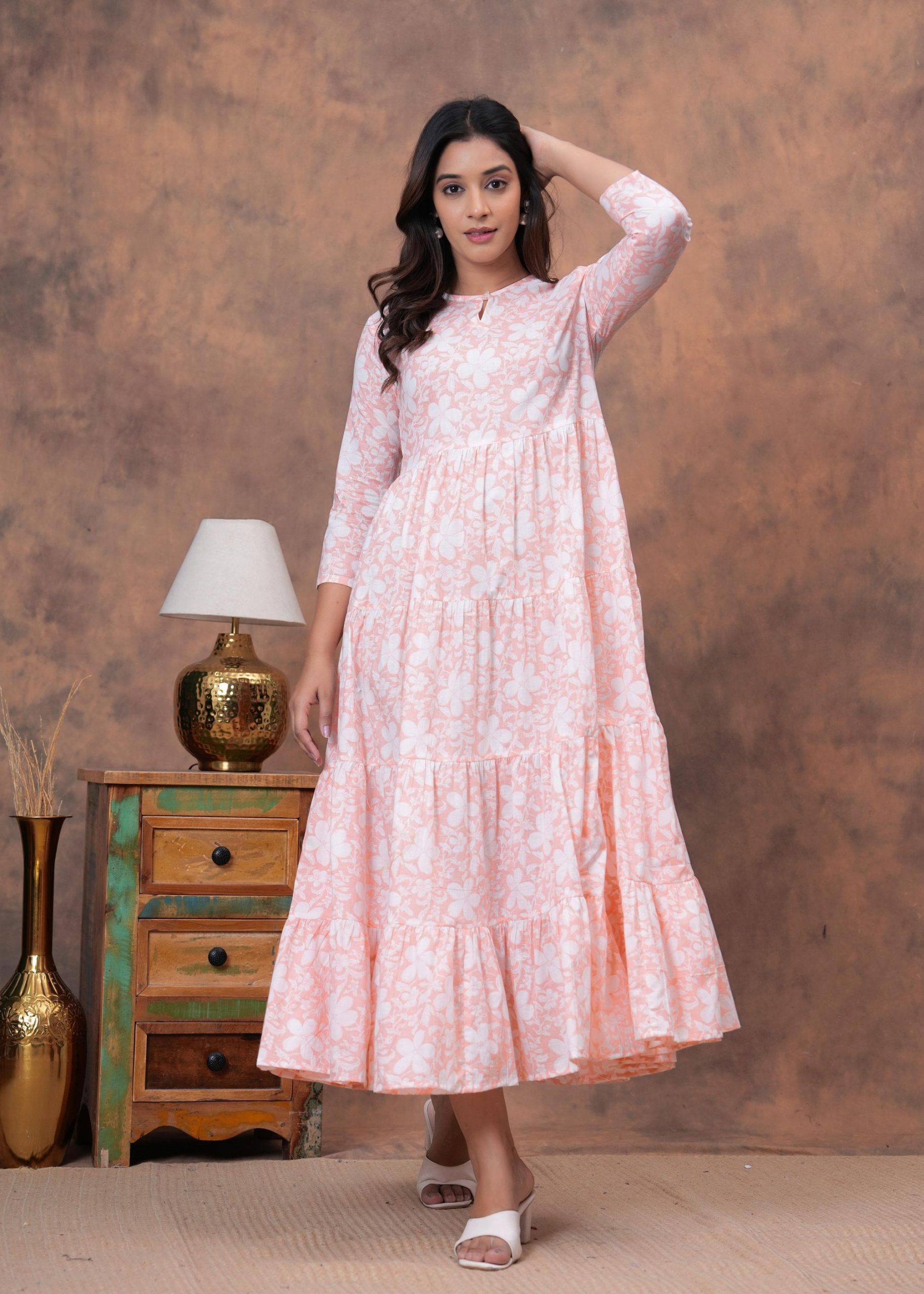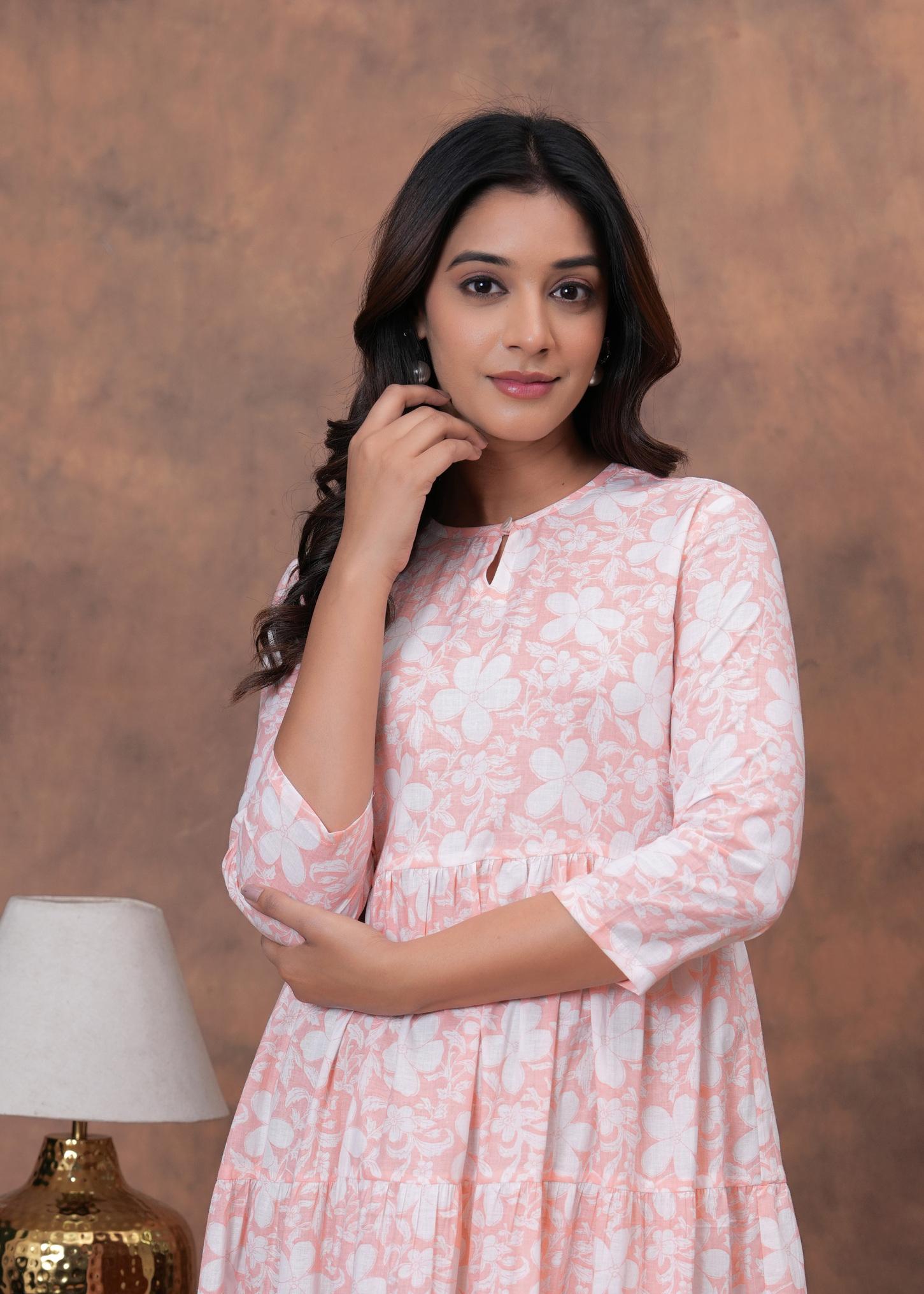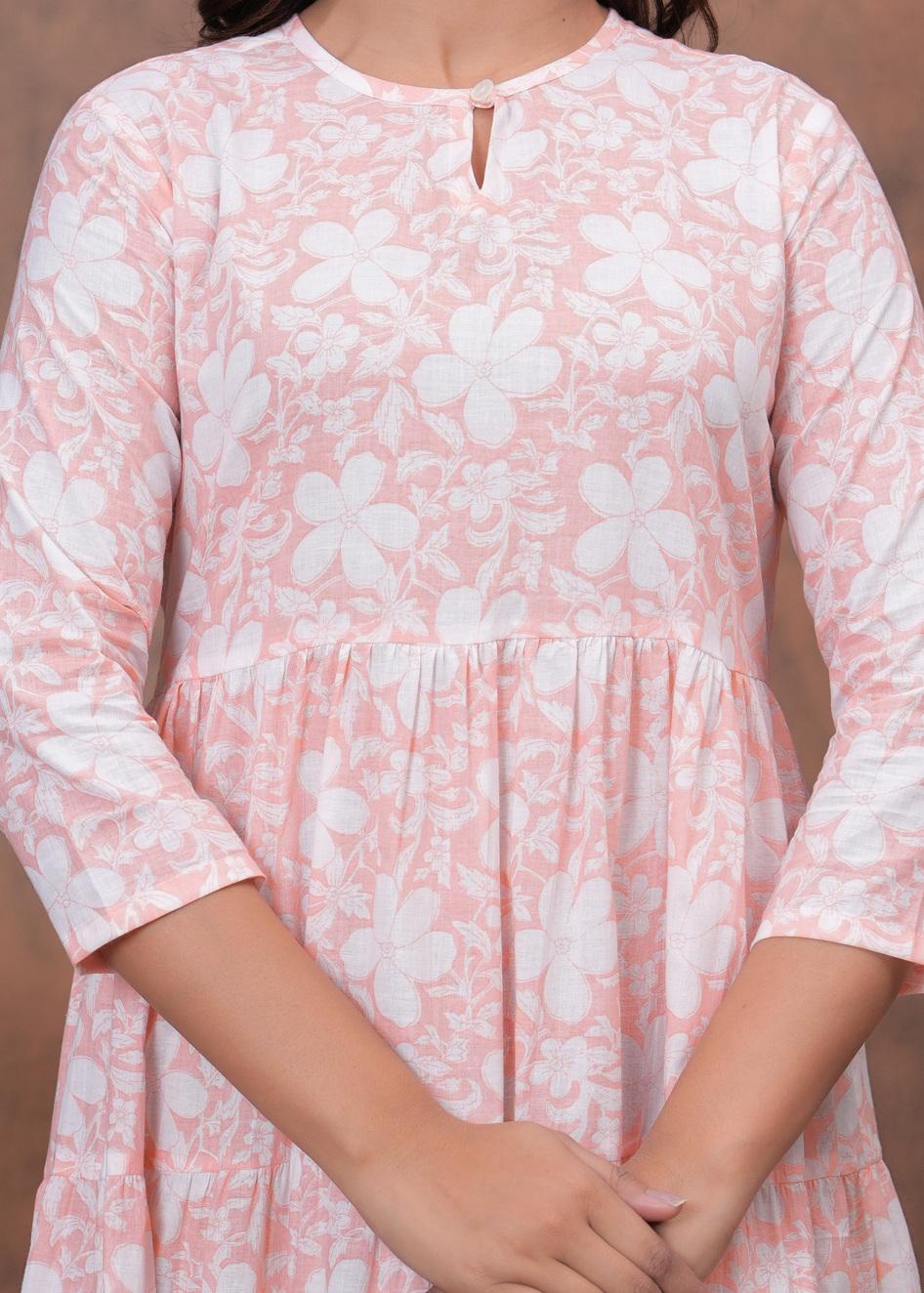 🌸 Kamee Peach Cotton Floral Dress – Casual Elegance with Comfort