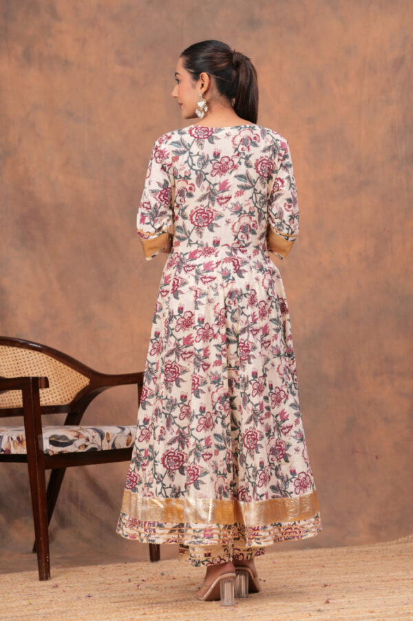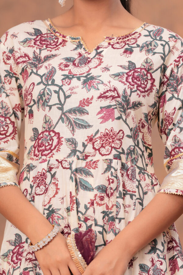 Elegant Design: A stylish V-neck kurta adorned with detailed prints, offering a chic, traditional look.