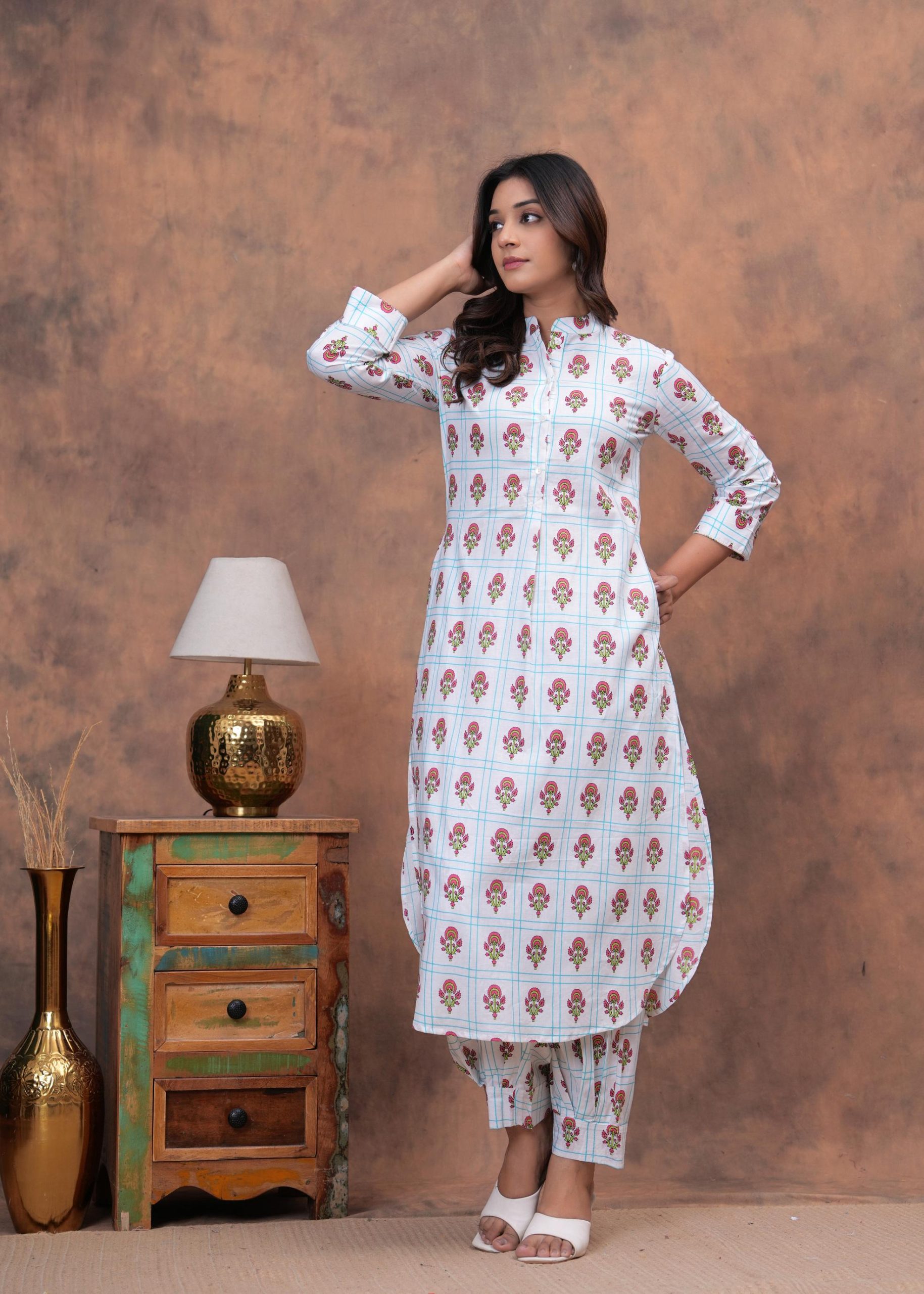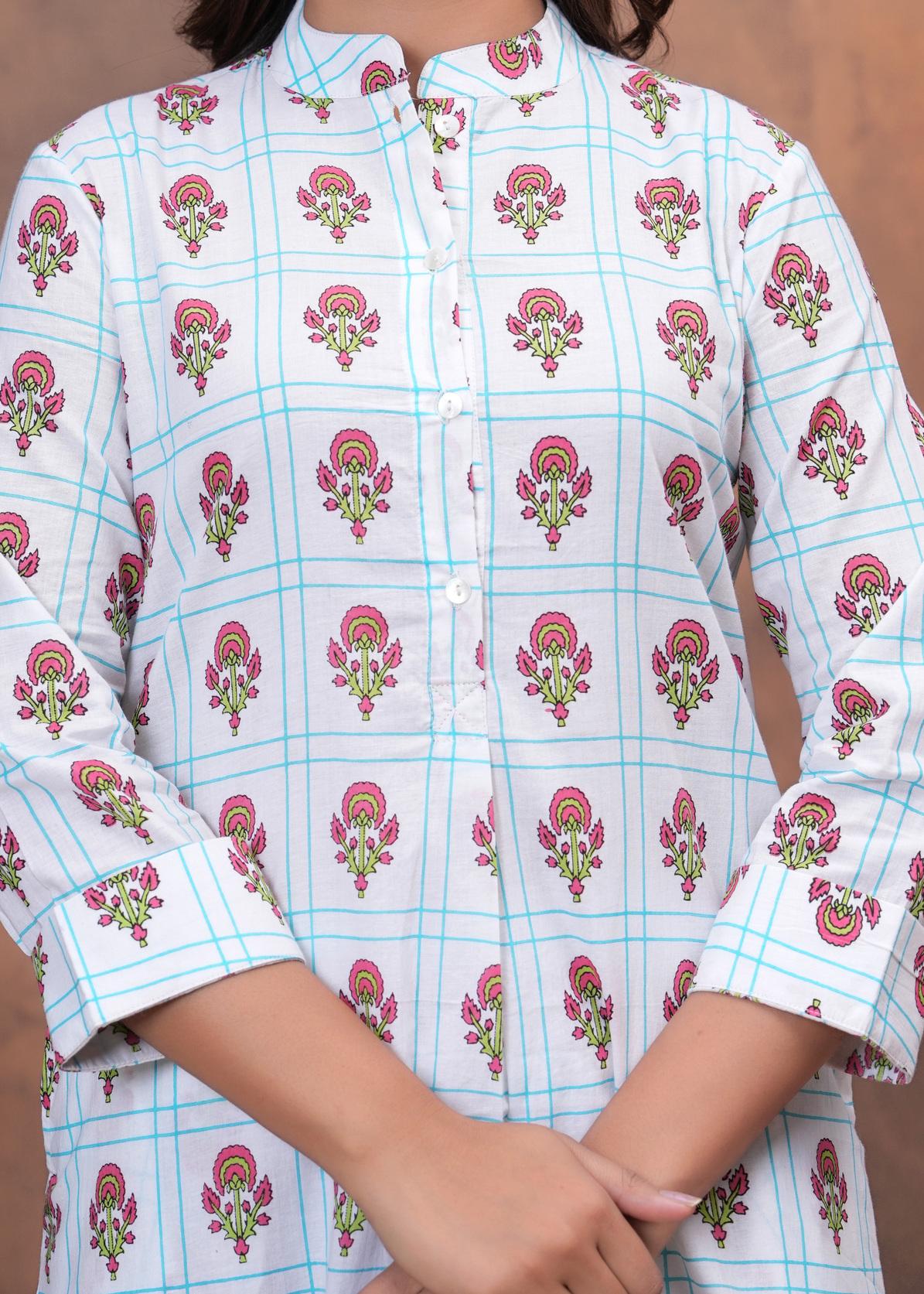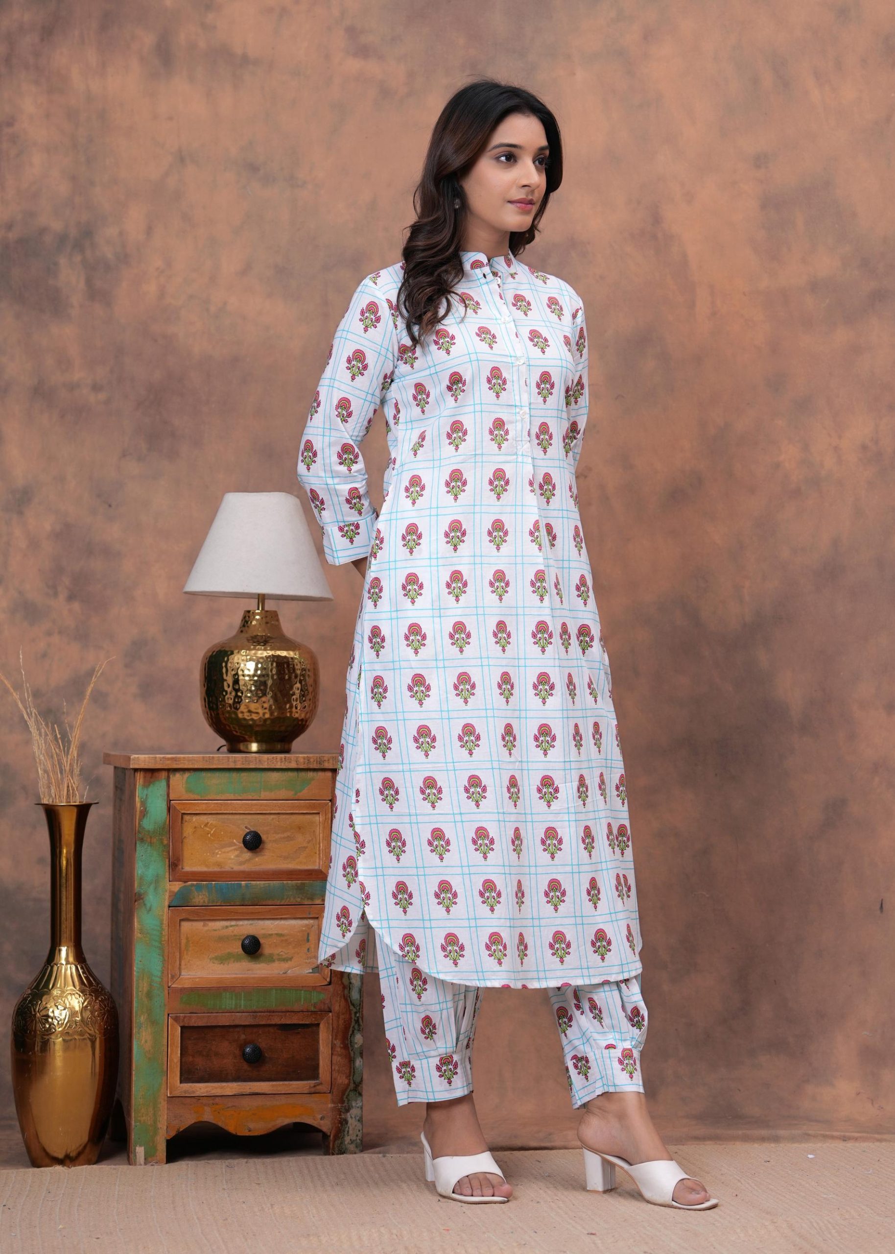 The Kamee Women Pure Cotton White Floral Co-Ord Set combines classic design with modern comfort, making it an ideal addition to any woman's wardrobe.