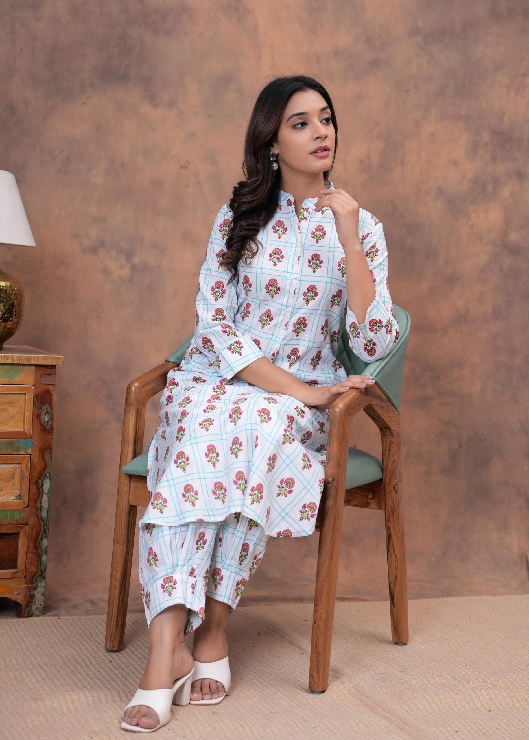 Kamee Women Pure Cotton White Floral Co-Ord Set